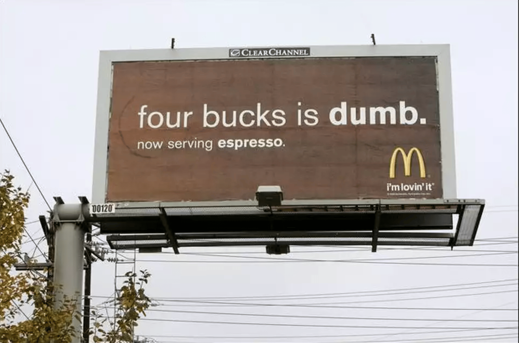 [Photo: McDonald's "Four Bucks is Dumb" billboard campaign, Seattle 2008. The aggressive advertising campaign targeted Starbucks in their home market during the company's financial struggles. Source: Campaign documentation via Seattle PI]