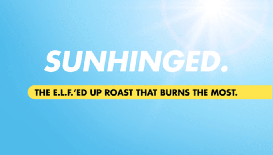 [Image: "Sunhinged" campaign visual showing blue background with white "SUNHINGED." text and yellow banner reading "THE E.L.F.'ED UP ROAST THAT BURNS THE MOST." Source: e.l.f. Beauty via BusinessWire]