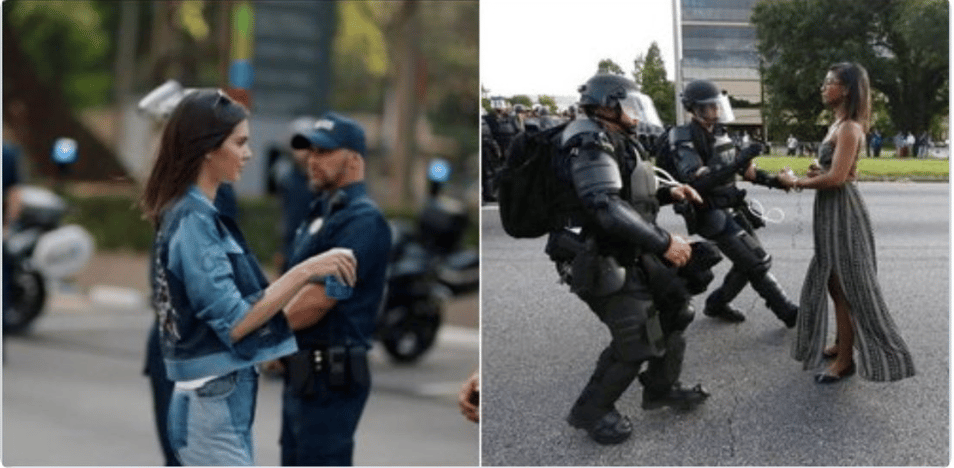 [Image: Viral Twitter comparison highlighting how Pepsi's ad trivialized real protest moments, contrasting Kendall Jenner's staged scene with photographer Jonathan Bachman's iconic image of protester Ieshia Evans facing police in Baton Rouge. Source: Twitter/@CharlesMBlow via ABC News]
